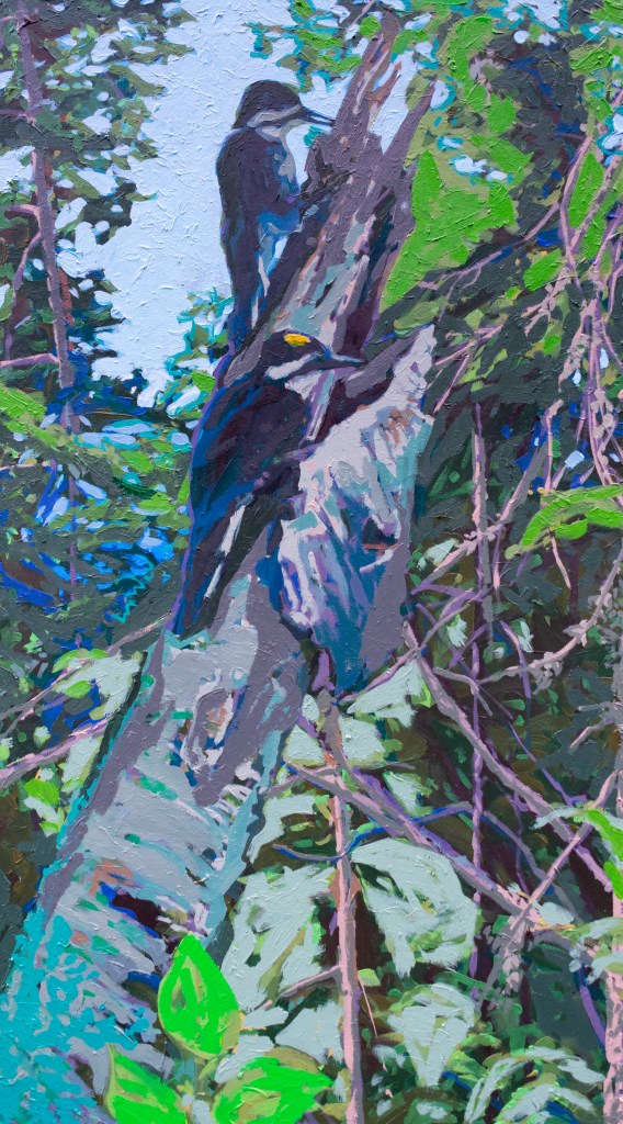 Warblers in the Green, 32×32″, oil on canvas, 2025, $2,000