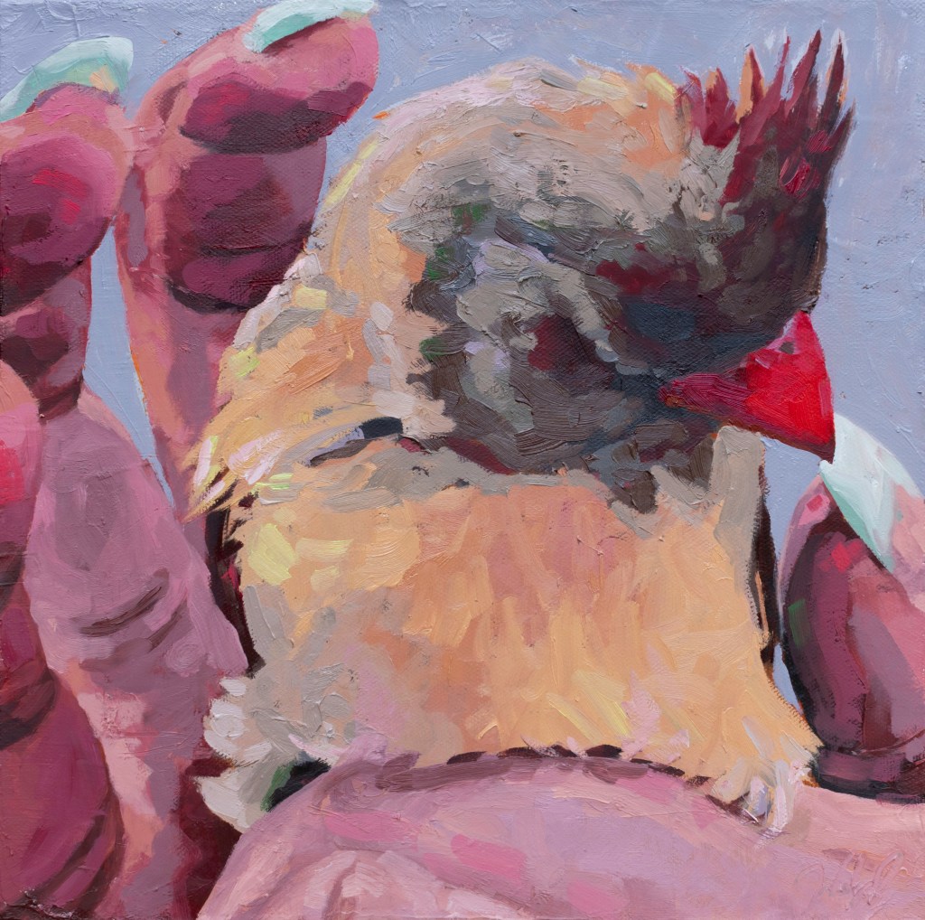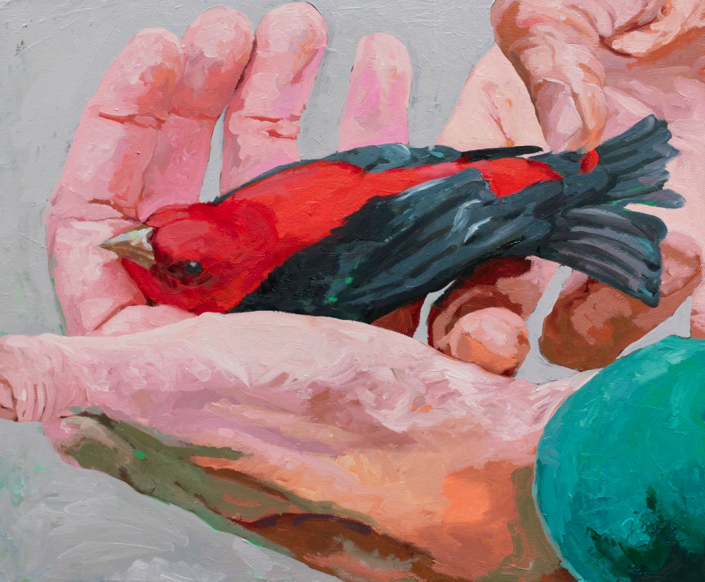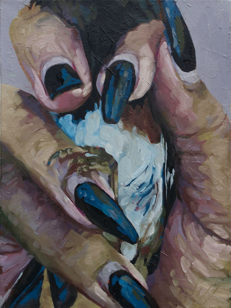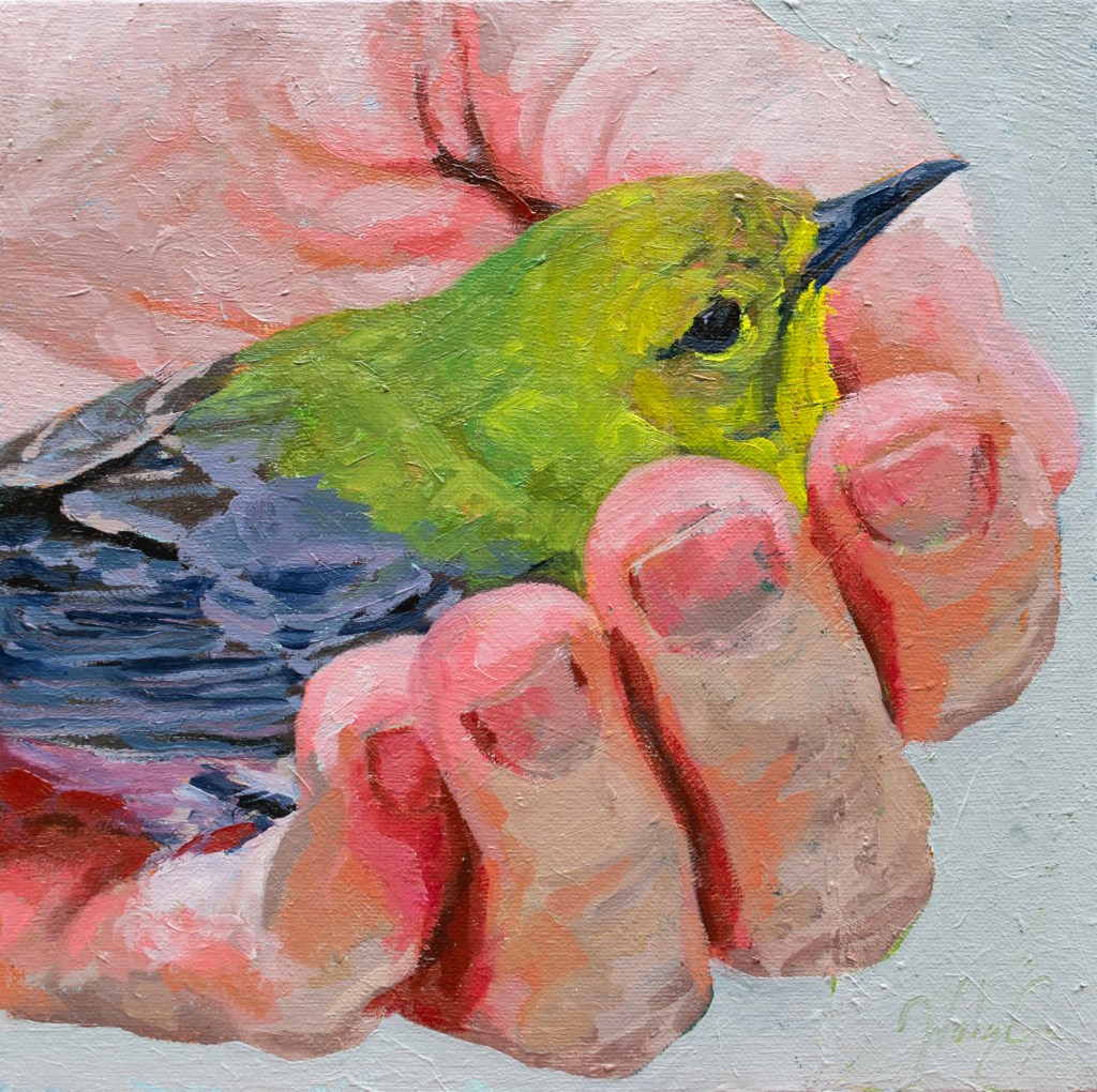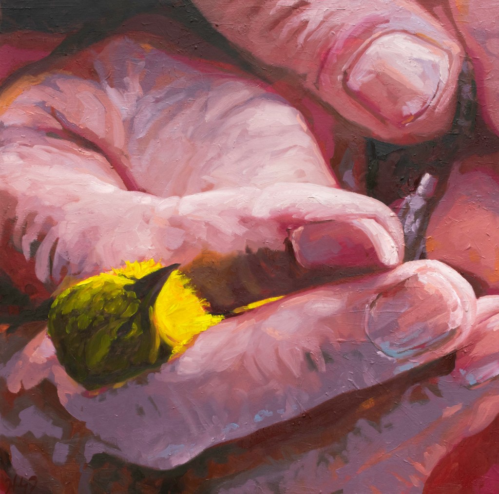 My recent body of work depicts images of birds and the human hand as seen during bird banding demonstrations. Bird banding is a process in which wild birds are captured and equipped with leg bands to study their movements and habits. In a series of oil paintings on canvas, I have been zooming in on images of scientists and volunteers handling wild birds during the banding process in order to educate the public on scientific research and conservation efforts, inspire a human connection with wildlife, and encourage more people to explore nature. Over the past several years, I have been participating in bird banding demonstrations and having conversations with scientists and birders to inform this project. The paintings will offer my viewers a unique, close-up experience with the many species of birds that live around us and encourage a connection with nature through the human hand and sense of touch.